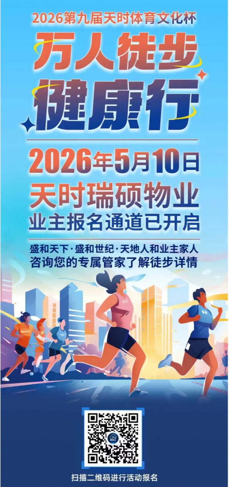 以脚步赴江畔之约,以同行续邻里温情,用活力拥抱夏日,用热爱点亮生活。2026第九届天时体育文化杯万人徒步健康行,天时瑞硕物业业主报名通道已开启,更多精彩详情也将陆续公布,敬请各位业主期待,让我们再度并肩,踏风而行,共赴下一场美好征程!